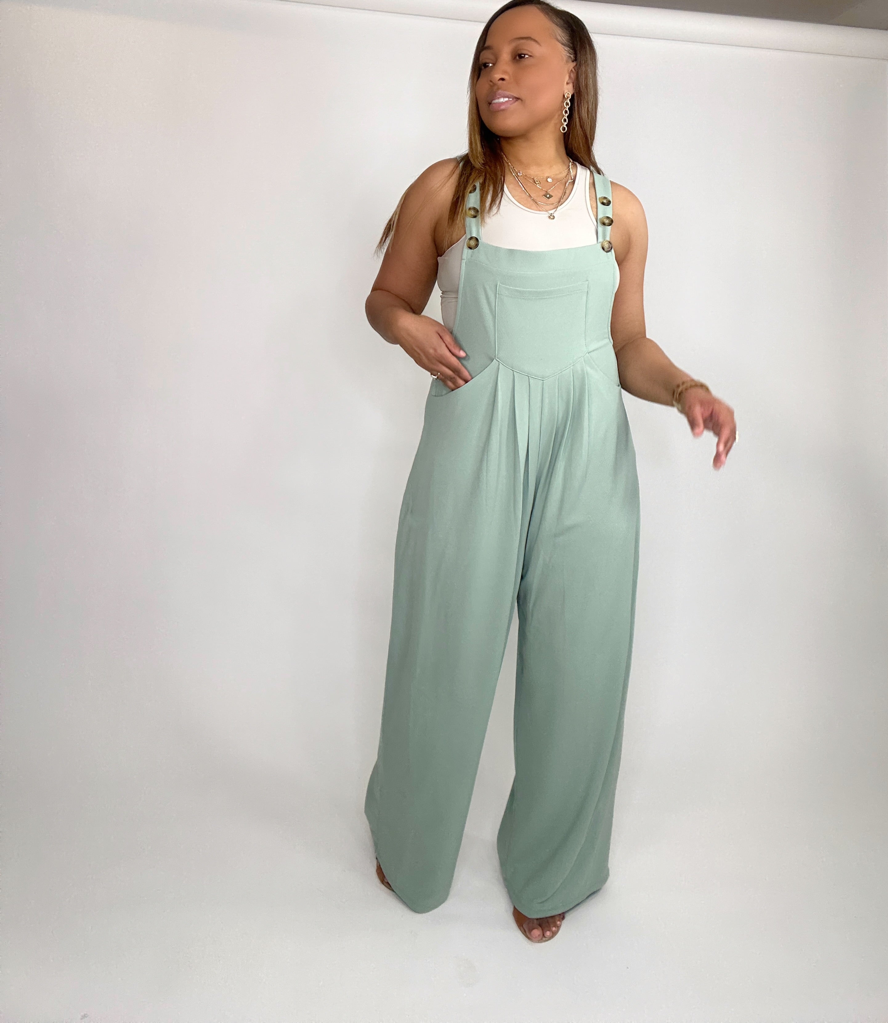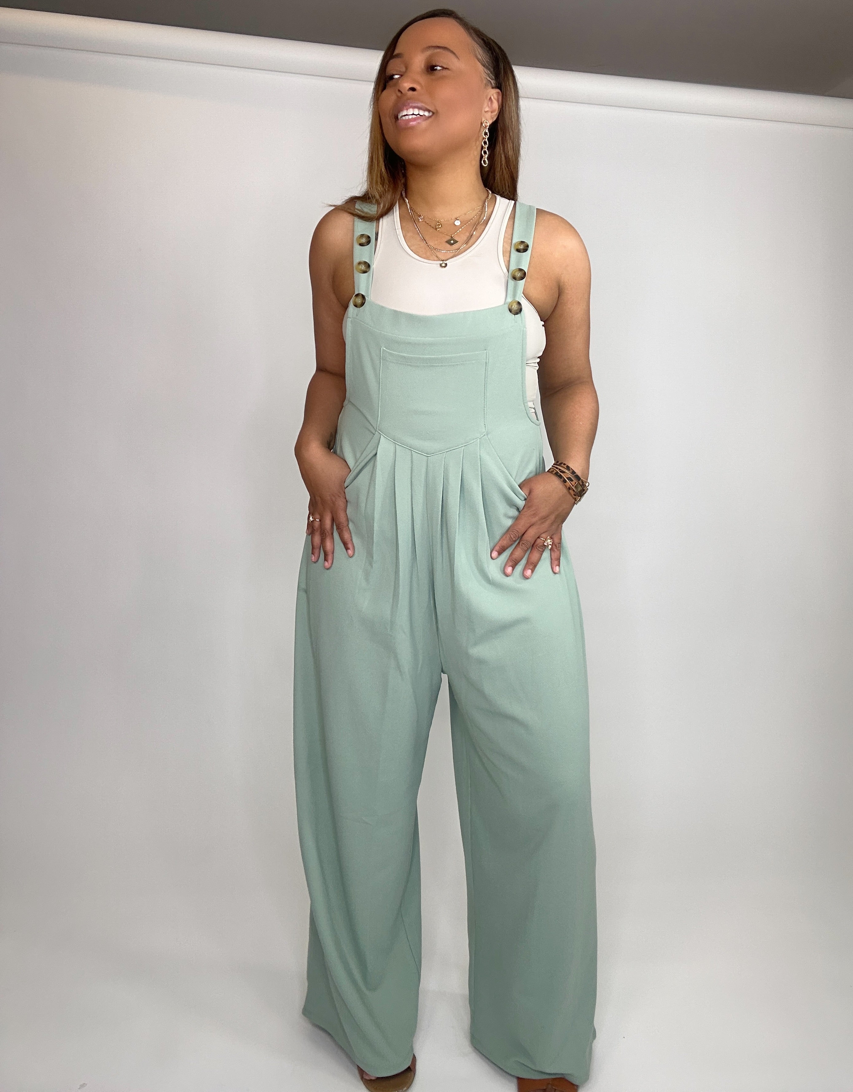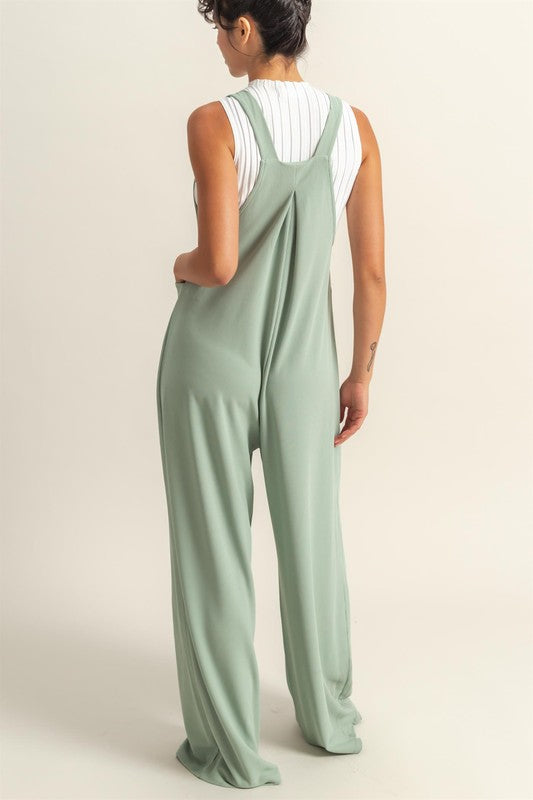Wide Strap Overalls with Pleated Front Detail and Pockets - Gum Leaf