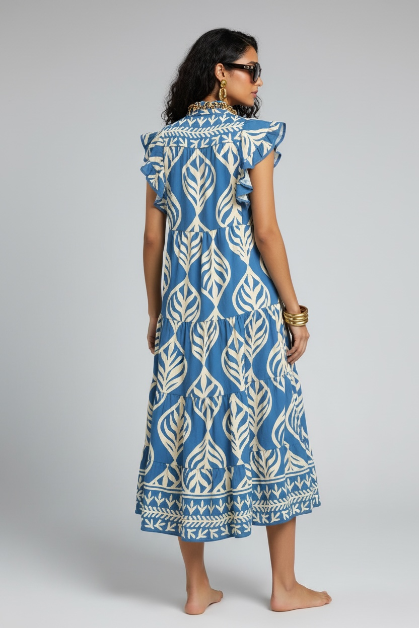 Leaf Print Ruffle Tiered Midi Dress - Cerulean