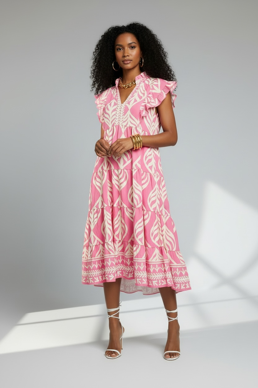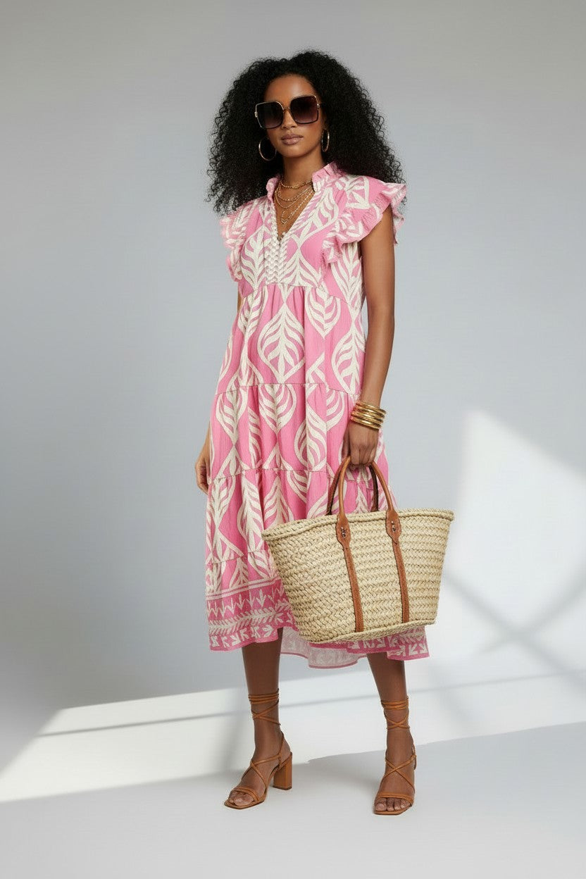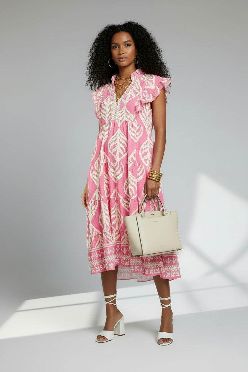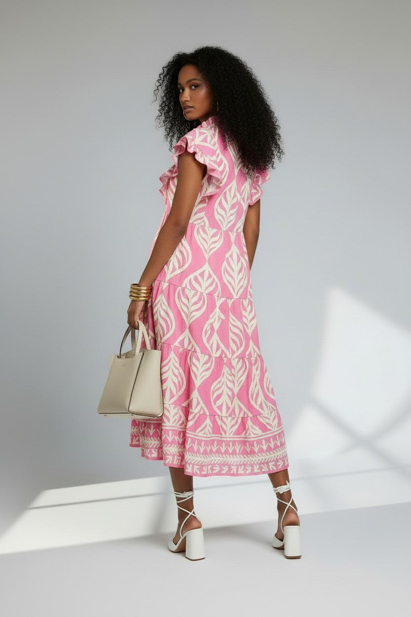 Leaf Print Ruffle Tiered Midi Dress - Peony