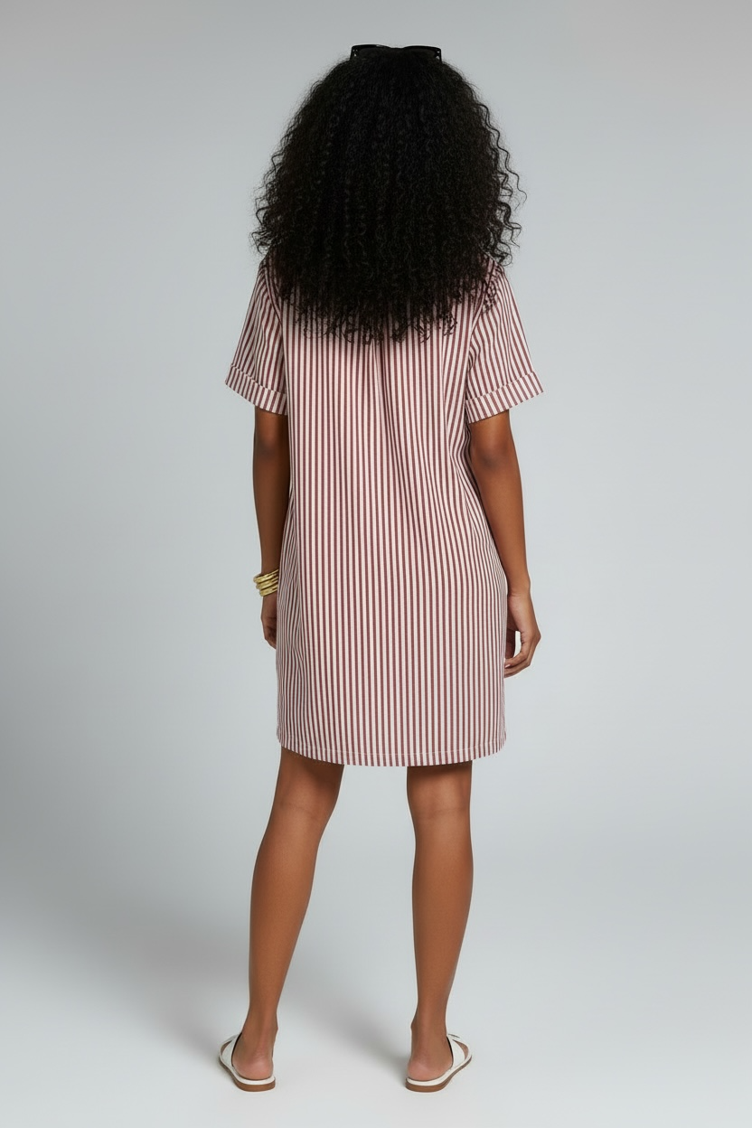 The Stripe Collared Half Button-Up T-Shirts Dress - Ruby Red