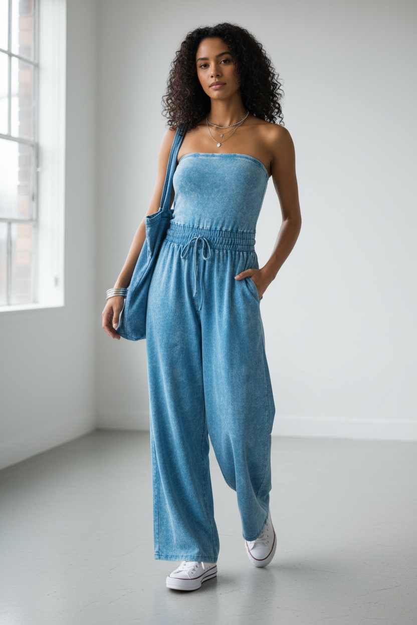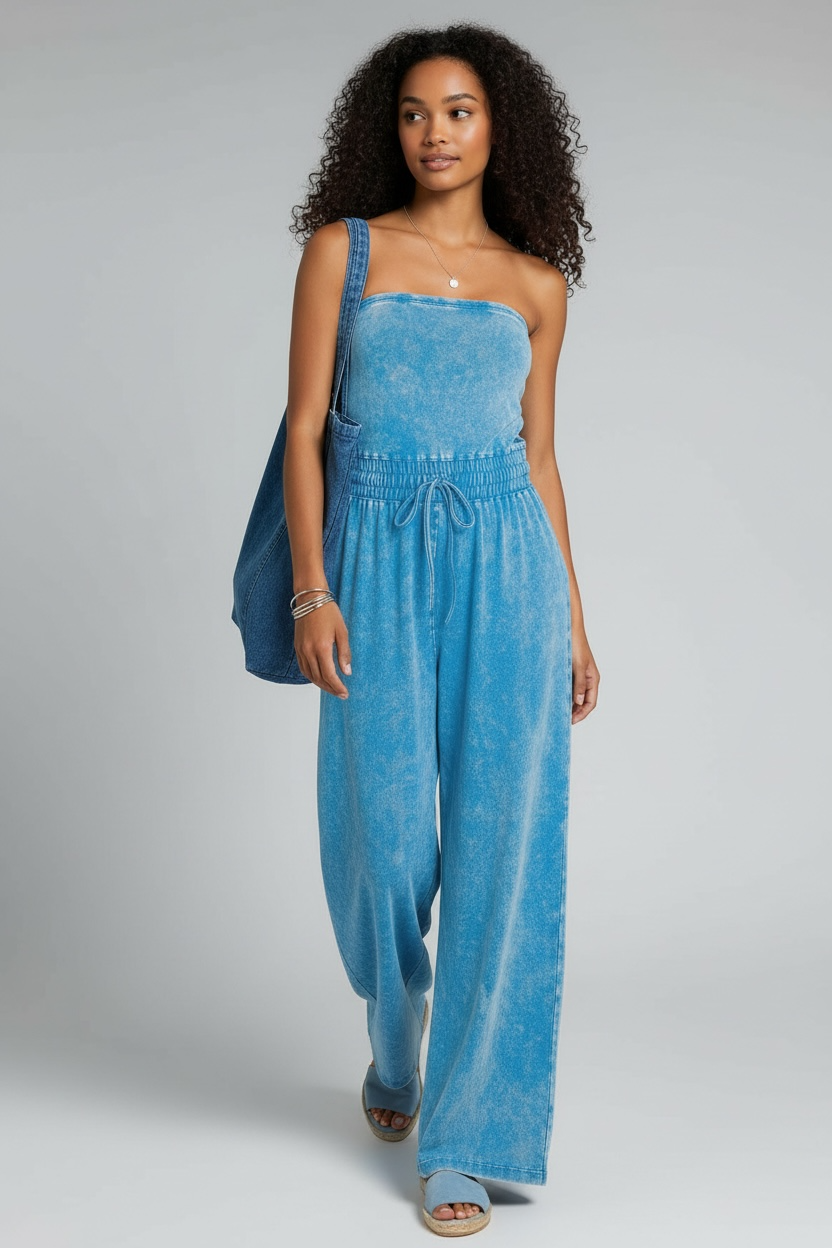 Unmatched Acid Wash Strapless Tube Jumpsuit - Sky