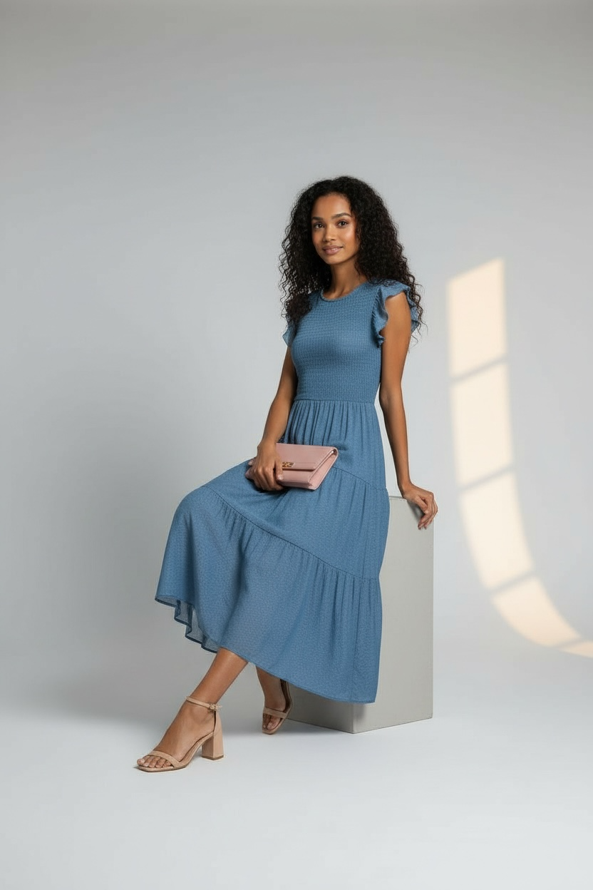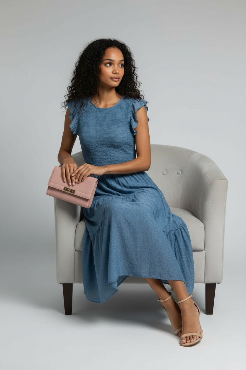 Romantic Ruffle Sleeve Midi Dress (Dusty Blue)