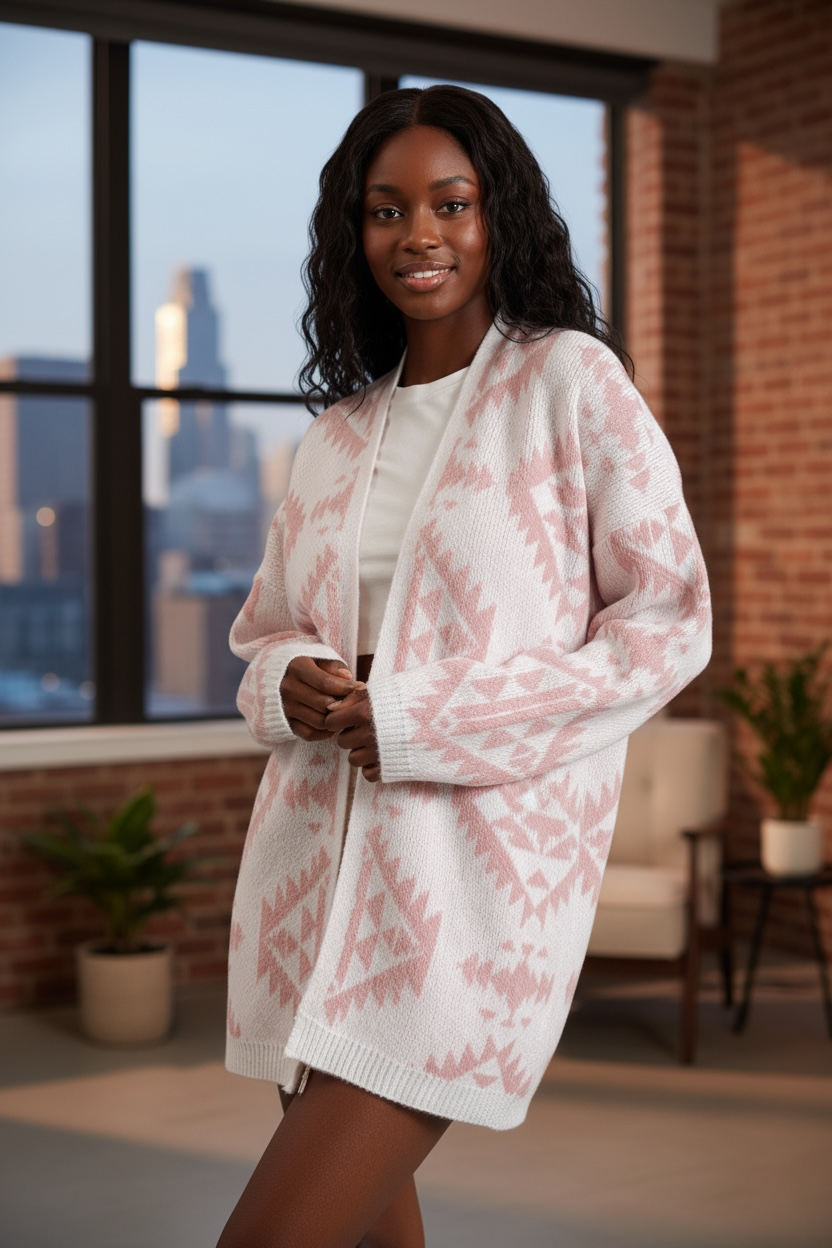 The Aztec pattern open front cardigan is a stylish and cozy addition to your fall wardrobe. The Aztec pattern adds a bohemian and unique touch to the cardigan. The open front design makes it easy to layer over your favorite tops. This cardigan is perfect for adding a pop of color and pattern to your outfit. Pair it with jeans and boots for a chic and comfortable look for cooler days.
